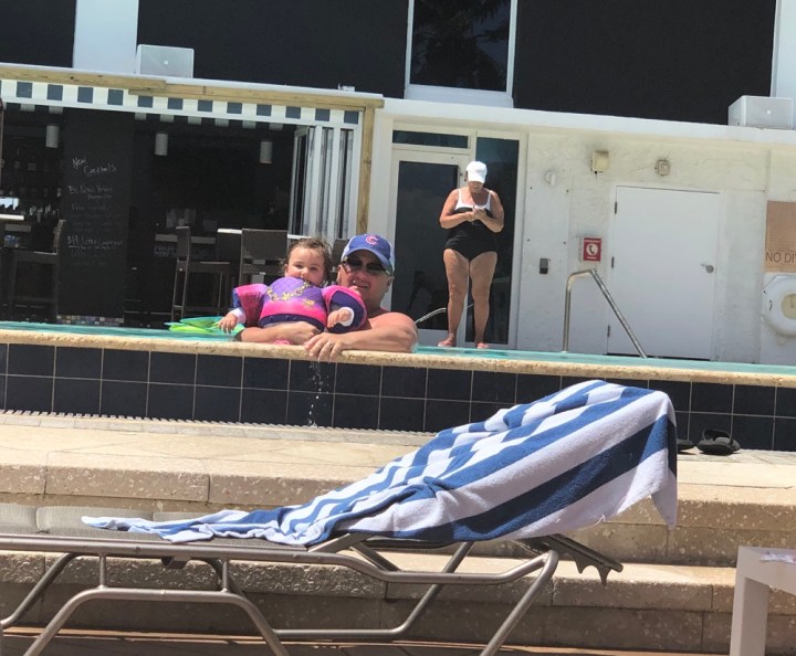 We made it out to the pool at about lunch time. Arabella was very anxious to get in the water. It would appear that after a few days in her infant raft, she has graduated to the toddler flotation device (a Paddle Pals Body Glove). She wore it most of the day and happily scurried and slashes around the pool steps where she could stand and move freely on her own. She ventured out into the pool with the adults a bit, but still has a ways to go there. It’s fun to watch her progression in such a short time.