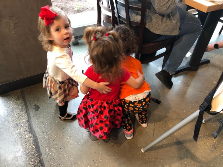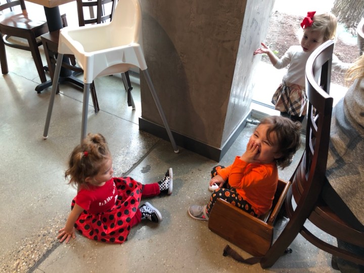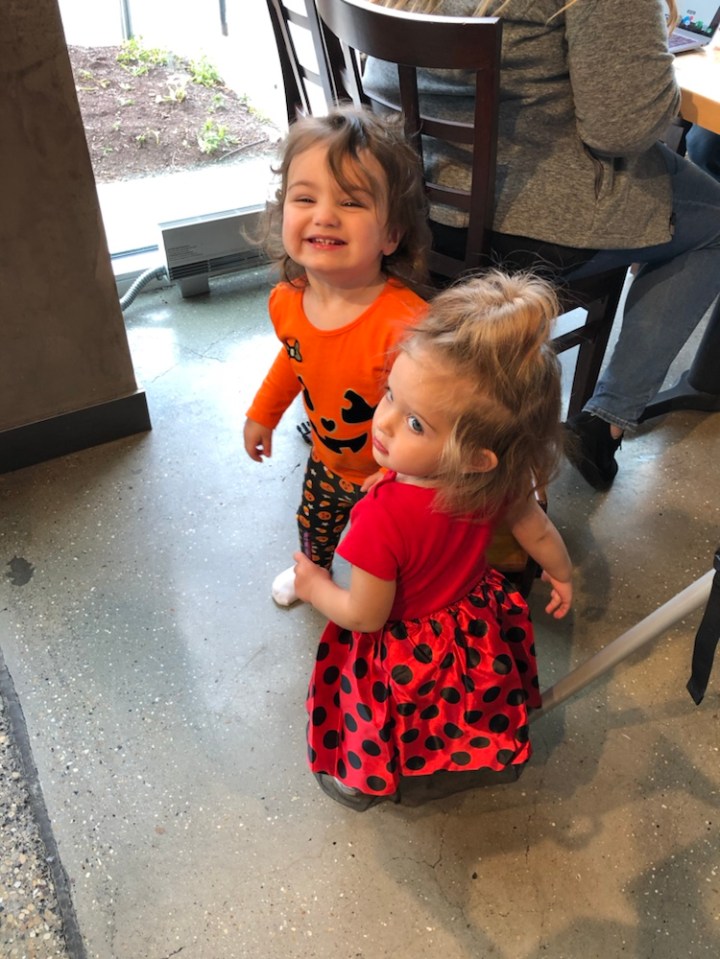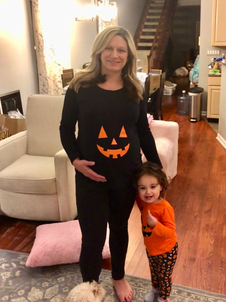 We kicked off Arabella’s second Halloween about a week early when the girls decided to get together for a fall lunch on Friday. Some of the minis wore their costumes, but I wouldn’t let Arabella wear hers because nothing good was going to come out of wearing a white fur unicorn costume to brunch before family photos. So instead, she wore her Halloween outfit— and I wore mine. Yes, it’s true, I caved and purchased a novelty maternity shirt. But honestly, when you are 36 weeks pregnant the week before Halloween and legitimately look like you have a pumpkin in your shirt— how can you not!?