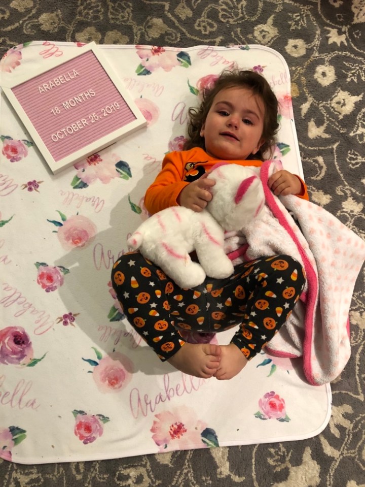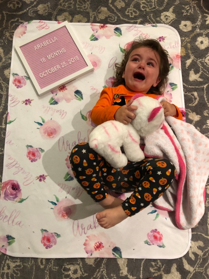 Friday was also Arabella’s 18 month doctor appointment. Doctor says she growing like a champ- 99th percentile across the board- and is very social. (She was very comfortable around him and even gave some smiles). Unfortunately, her smiley demeanor did not continue at home when we tried to take her 18 month photos. But we still managed to get a pseudo-keeper!