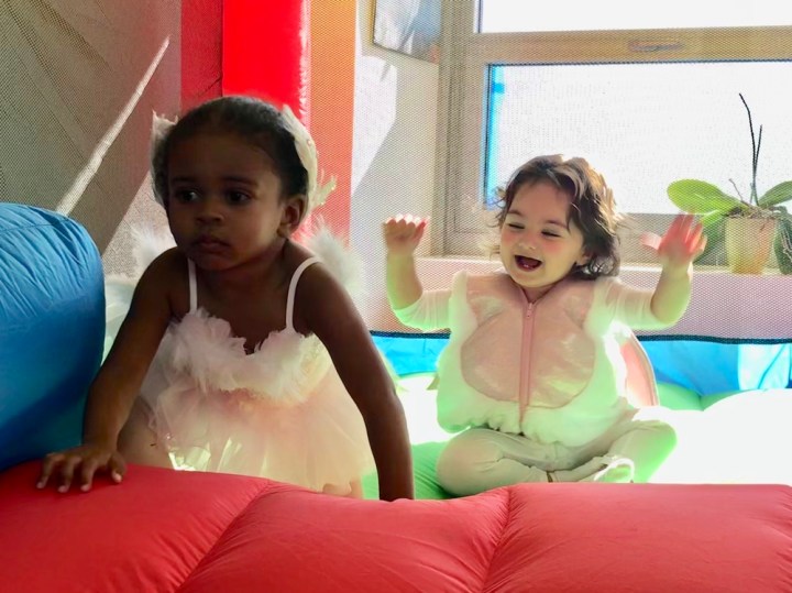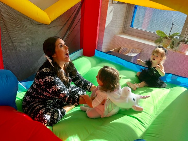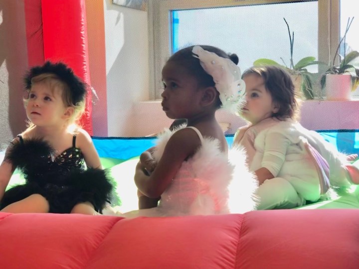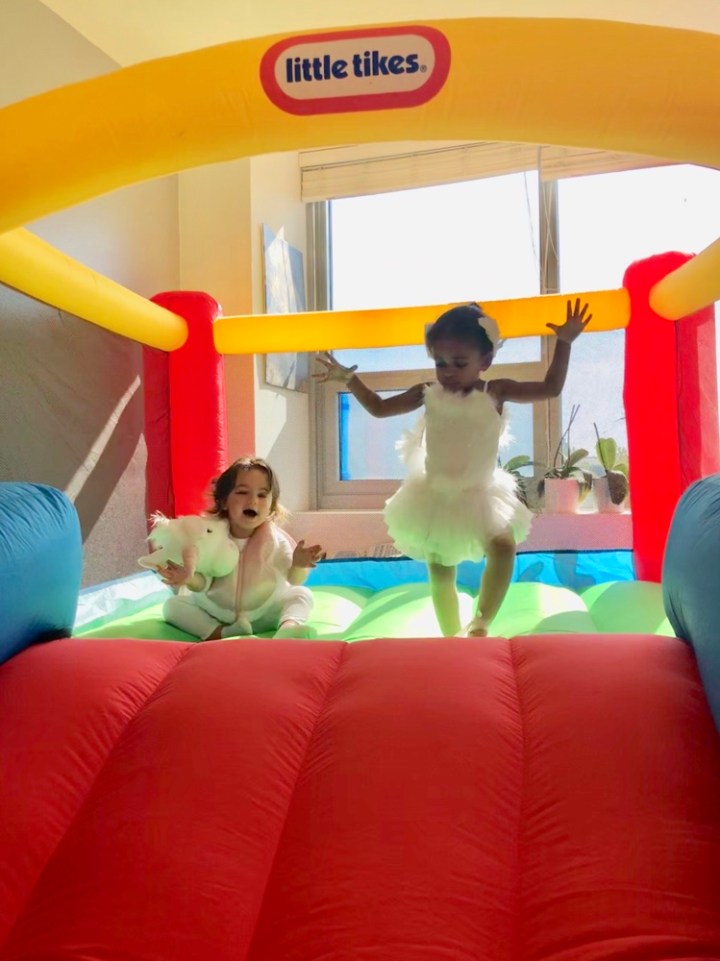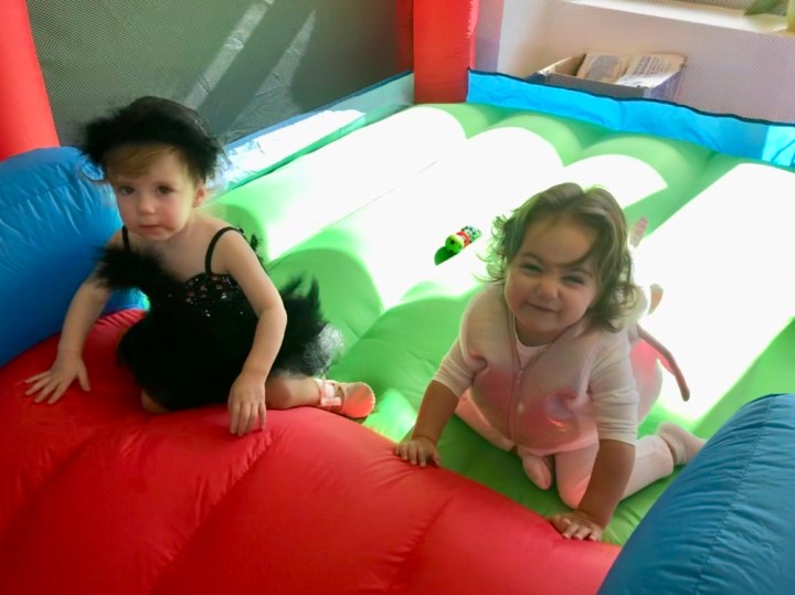 On Sunday, we got invited to a Halloween party in Hyde Park. Once Arabella got past her initial shyness (she’s been going through a shy stage), she was excited to see Grace and Scarlett. She happily jumped in Scarlett’s bouncy house and ate iced Halloween cookies until it was time to come home.