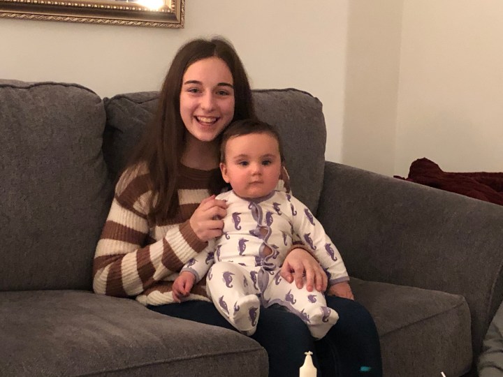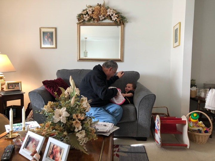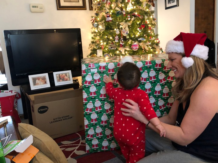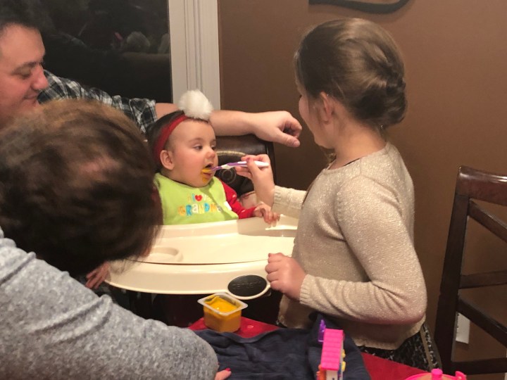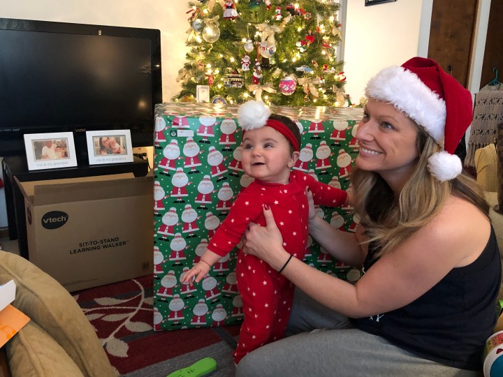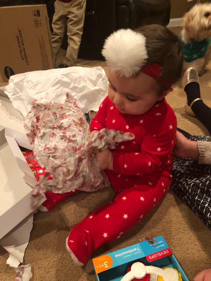 Arabella hasn’t slept much since coming to PA. At home (in her dark, silent room) she sleeps about 12 hours a night, plus takes two naps during the day. At my parents house, her crib is in the main living area, which is not only bright and noisy but also filled with activity. As soon as the first person wakes up in the morning, Arabella is up too ready to play. And naps? We’re lucky if she tosses around in silence for a half hour. SO, it wasn’t surprising when she was up before 8 on Christmas despite having been up until midnight.