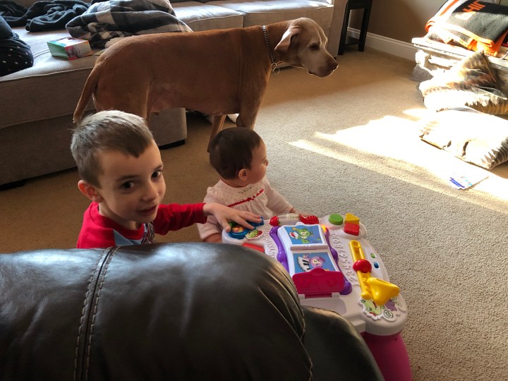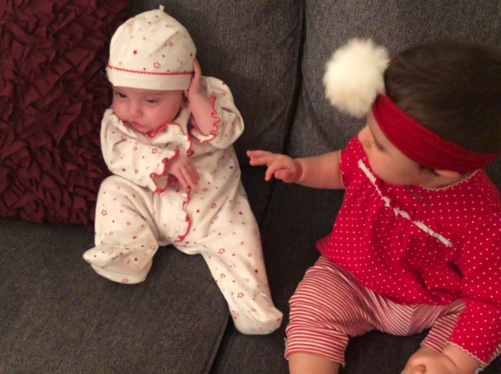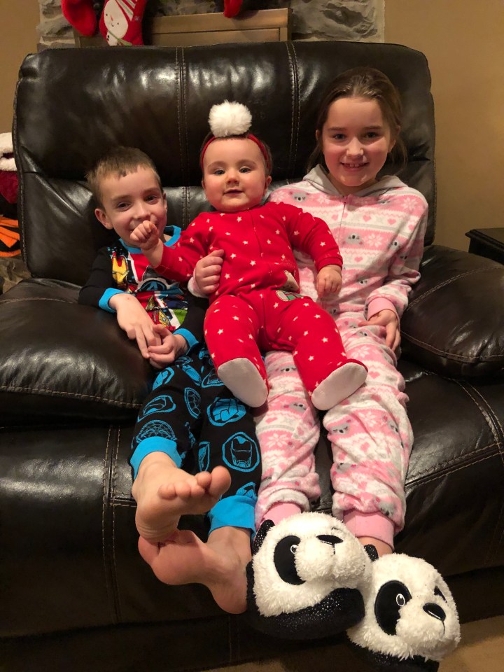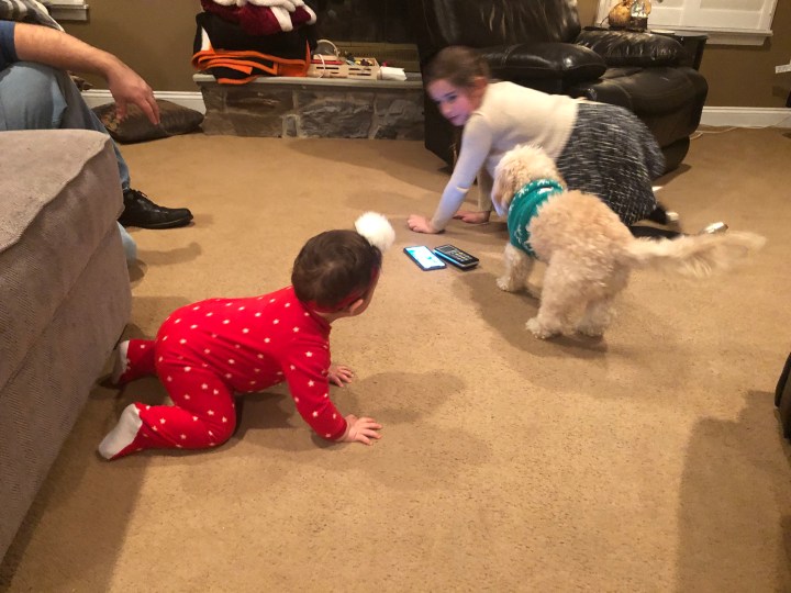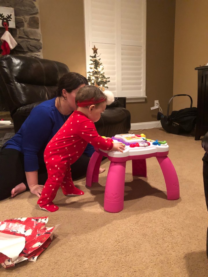 The morning after our first night in Philly is always rough. The kids are tired from the excitement of Christmas. The adults are tired from the excessive celebrations that come along with Christmas. But somehow, this year was significantly less rough than usual. We all gathered downstairs for coffee and ate a French toast casserole baked by Jarmon’s mom. Arabella jumped right into playing with Emmie and Vinnie. Emmie tried to teach her how to crawl— and Arabella showed off her standing skills at her new activity table.