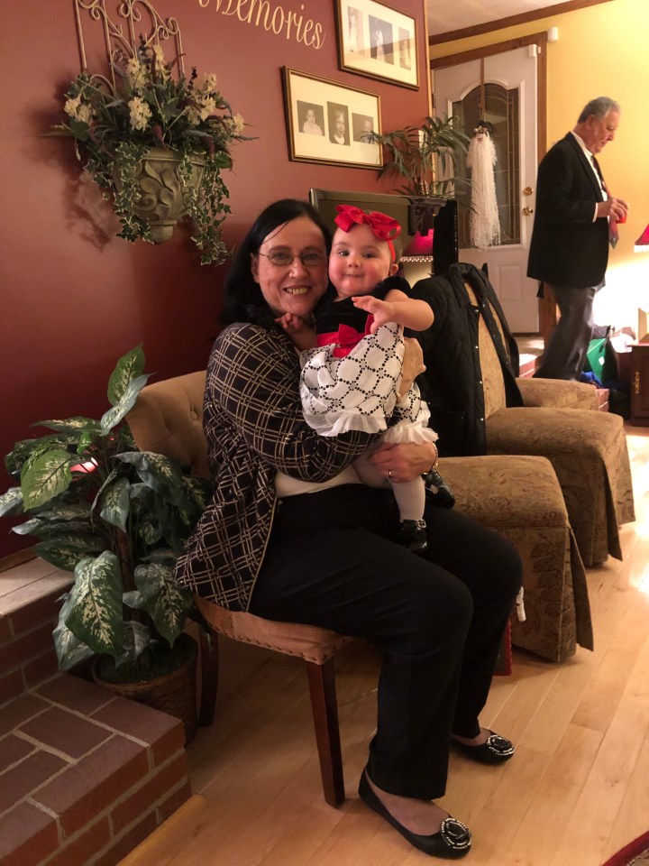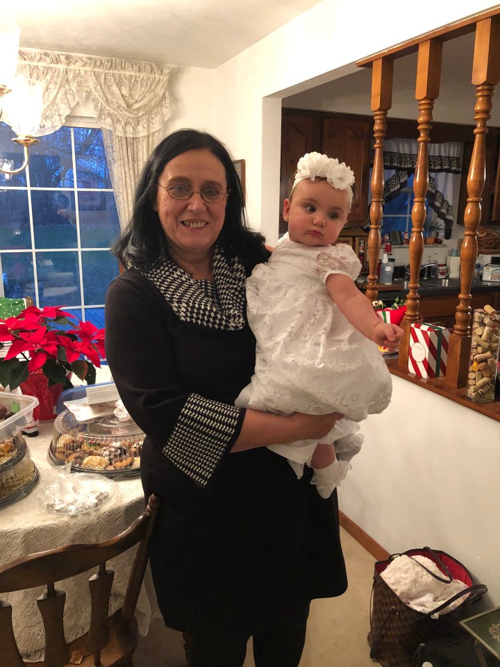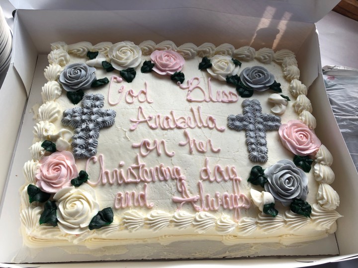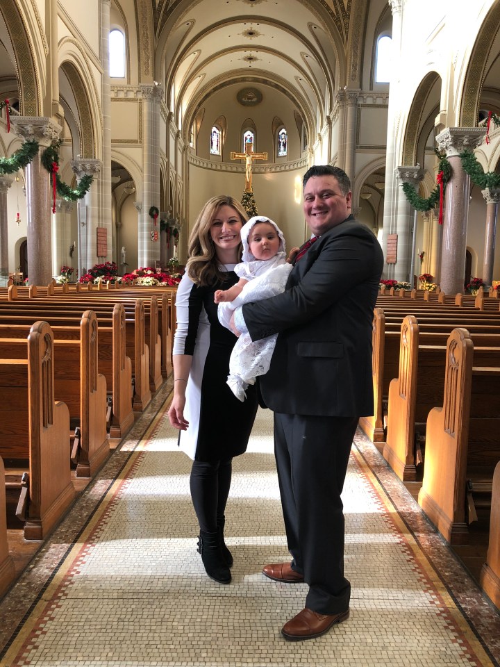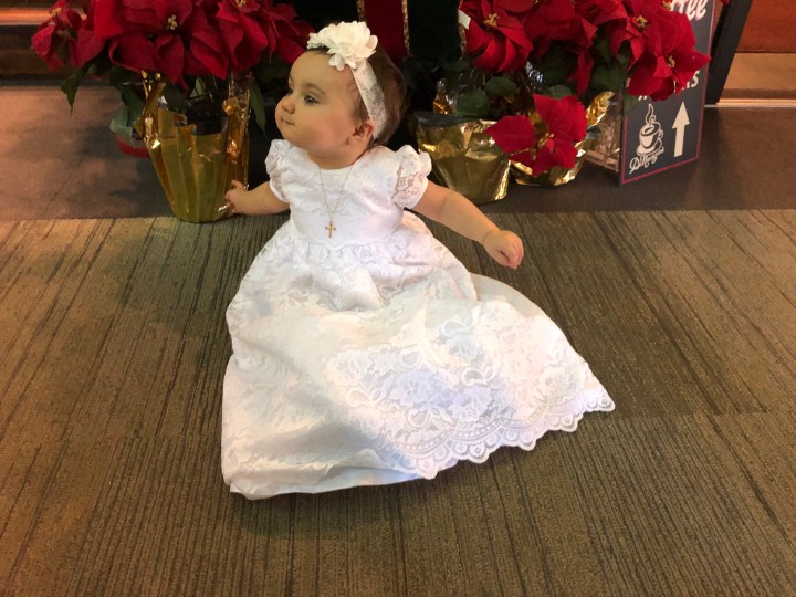 After the baptism we all went to Denunzio’s for lunch and cake. We were thrilled to have Father Earl join us. Arabella got some beautiful baptism gifts. On the way out, Jarmon had already buckled Arabella into her car seat, but I noticed a great photo opportunity in front of some holiday decorations. I was pretty sure jarmon was going to murder me for getting her out of her car seat, but you know the saying about opportunity knocking. The photos were spectacular. Some of my favorite (amateur) photos of the day. The photos showcased the entirety of her beautiful gown and she looked adorable. Well worth every moment of hassle. Oh, and as you are looking at the cute photos in front of the Christmas decorations, take note of her special necklace. The gold cross was purchased by me at the Vatican and given to my grandmother as a souvenir from my trip. She passed away two years ago, but my mother kept the cross and passed it along to Arabella to be worn on her baptism day.