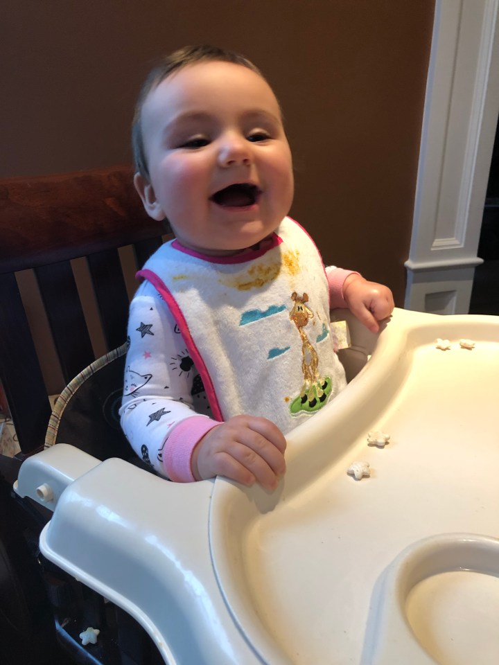 Also, here’s Arabella’s 7-month photo, which I made sure to take before heading out into the “blizzard.” (DD spent the weekend teaching her how to clap– pretty cute, right?)