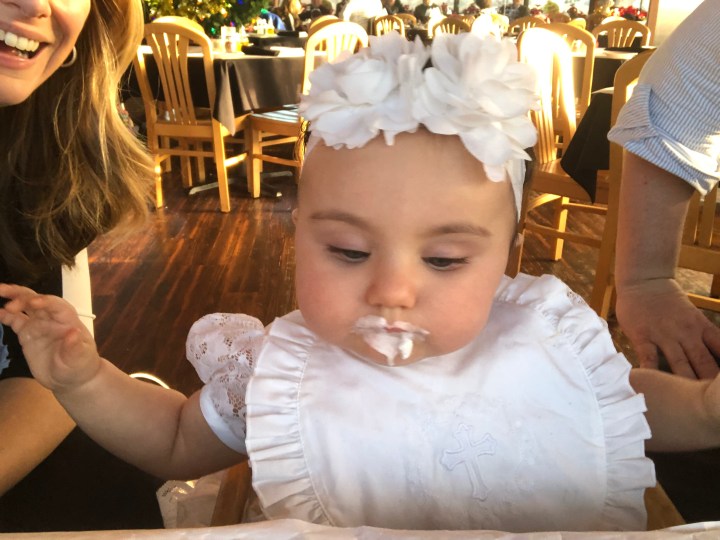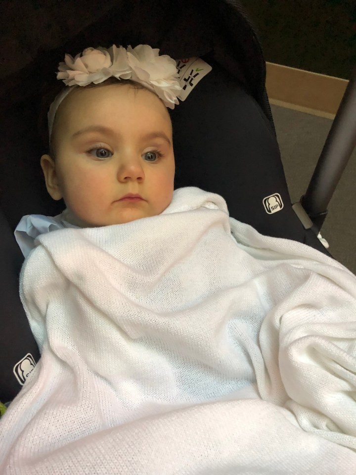 I fed Arabella in the back of the church when we arrived. I’m not sure if she got heavier over our holiday vacation or if she was just more difficult to hold in her elaborate baptism gown, but feeding her was a struggle— as was changing her diaper. By that time mass was letting out and there was not a changing table in the restroom, which meant we were sprawled out on the floor. Arabella was not interested in sitting still.